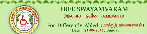 Chennai Sai Thunai Matrimonials organizing a Free Swayamvaram on 21st May 2017, Sunday for Differently Abled at Kamadenu Kalyana Mandapam (Formerly Kamadhenu Theatre), Luz, Mylapore from 8 A.M. to 4 P.M.