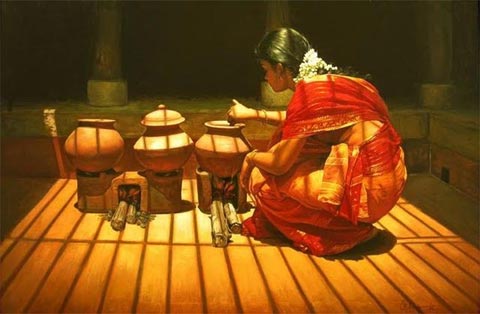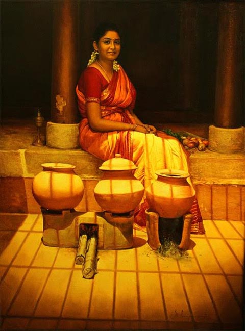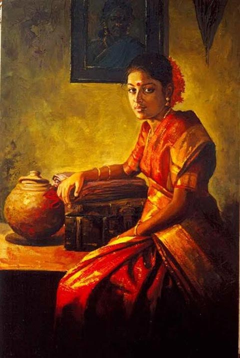 S Elayaraja is known for his oils and has embarked a renowned place in the world of art. He draws his inspiration from the land where he was brought up and portrays them onto his canvas will million microns of richness and vibrant colors. He mainly focuses on the Tamil women, their culture, tradition and lifestyle and paints his observations with such finesse that people often misinterpret it as a lens captured photograph. S Elayaraja �s paintings are a blast of emotions and expressions revealing the story of each woman he paints. This realistic artist successfully brings out the essence of a peaceful village life soothing the eyes who has only witnessed the exhausting urbanization.