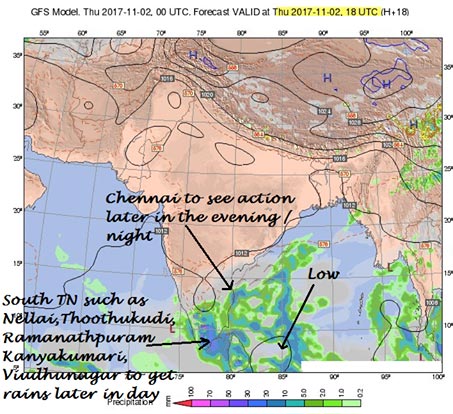 The low pressure lies in the same place off Sri Lanka coast and its going to remain around that area for next 4-5 days. It will throw up bands again and again. So more rains are expected as the bands are formed. Even in the day or evening some stray rains are expected to pick up.