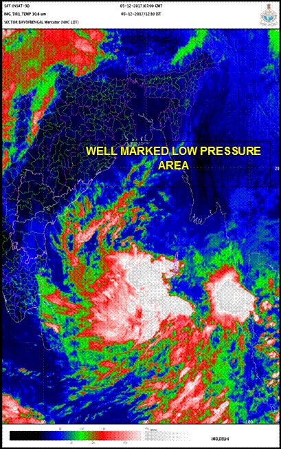 The well marked low pressure area over southeast Bay of Bengal and adjoining south Andaman Sea now lies over southeast Bay of Bengal and neighbourhood. It is very likely to become a depression over the same area during next 12 hours and further intensify into a deep depression during the subsequent 48 hours. It is very likely to move west-northwestwards towards north Tamil Nadu,south Andhra Pradesh coasts during next 3 days.