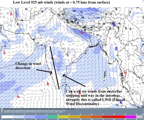 You can see the image how easterly winds from Bay of Bengal move into Tamil Nadu and stops mid way and the other side from Arabian sea the wind direction is different. This is how we should identify the Line of Wind Discontinuity. This causes instability in atmosphere and creates rains. Though the Discontinuity is from maharashtra, the rains will be limited from South Interior Karnataka to interior Tamil Nadu where there is moisture content. These are temporary rains. Sometime the Line of Wind Discontinuity lasts for days. Sometimes like the present instance, it lasts only a day and half. Tomorrow the Line of Wind Discontinuity disappears. So will the rains in the western interiors. Its a one day affair, so lets enjoy what the nature gives us.