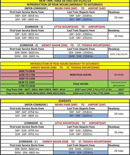 The current peak-hour frequency is every 9-10 minutes. This is now changed to every 7 minutes between Shenoy Nagar and St. Thomas Mount. This frequency will be during peak hours - from 8.30am to 10.30am and from 5pm to 8.30pm.