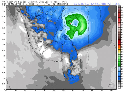 Landfall location is likely between Pondy/Cuddalore to Nagai/Vedharanayam as a very weak Cyclone