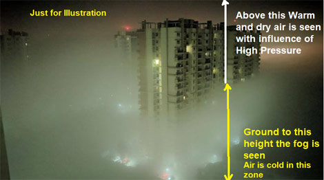 Even in Navalur (Chennai fog taken two days ago) we can see fog is only few hundred meters from the ground level till the height where there is moisture (see the pic enclosed). Above which the air is very dry.
