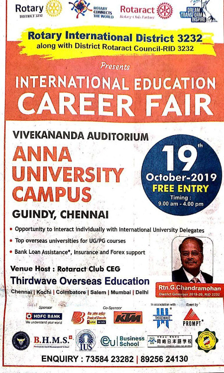 Rotary International District 3232 presents International Education Career Fair in Vivekananda Auditorium, Anna University, Guindy, Chennai.