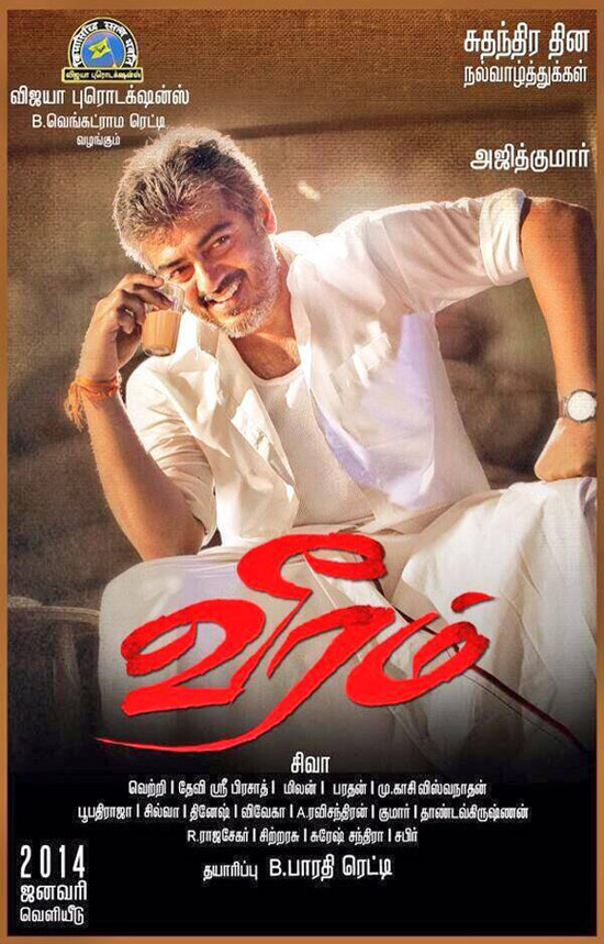 Veeram directed by Siva has Ajith and Tamannaah in the lead along with Vidharth, Santhanam and Pradeep Rawat in supporting cast. The film has music by Devi Sri Prasad.