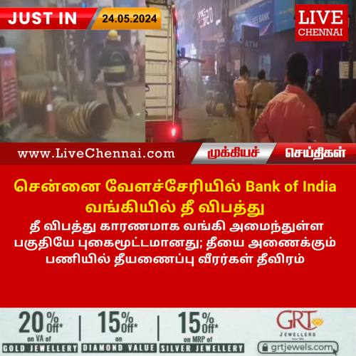 A sudden fire broke out at the Bank of India branch located on Velachery Main Road in the Dhandeeswaramarea of Chennai. The bank operates near an ATM, and a significant amount of smoke was observed in the area for over an hour.