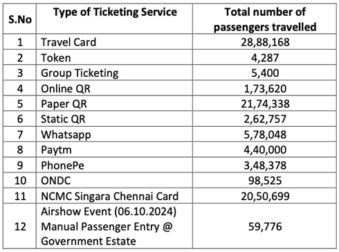 CMRL has always endeavored to provide the people of Chennai with a safe, efficient, and reliable travel partner. A total of 90,83,996 passengers have travelled in the Metro Trains from 01.10.2024 to 31.10.2024.