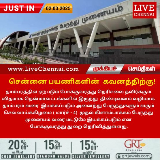 This decision follows the Tamil Nadu State Transport Corporation’s (TNSTC) move to terminate long-distance buses at Kilambakkam instead of Tambaram, particularly those operating via Chengalpattu and Tindivanam. The change was recommended by the Tambaram City Traffic Police to manage increasing vehicular congestion in the area.