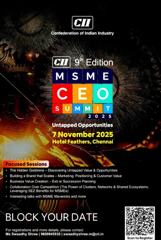 The Confederation of Indian Industry (CII) will host the 9th edition of the MSME Summit, aimed at empowering MSME leaders with strategic insights to strengthen their businesses through technology adoption, innovation, and sustainable growth. The summit will address contemporary challenges and emerging opportunities, offering comprehensive perspectives from top industry experts and thought leaders.