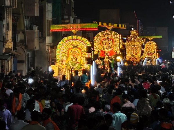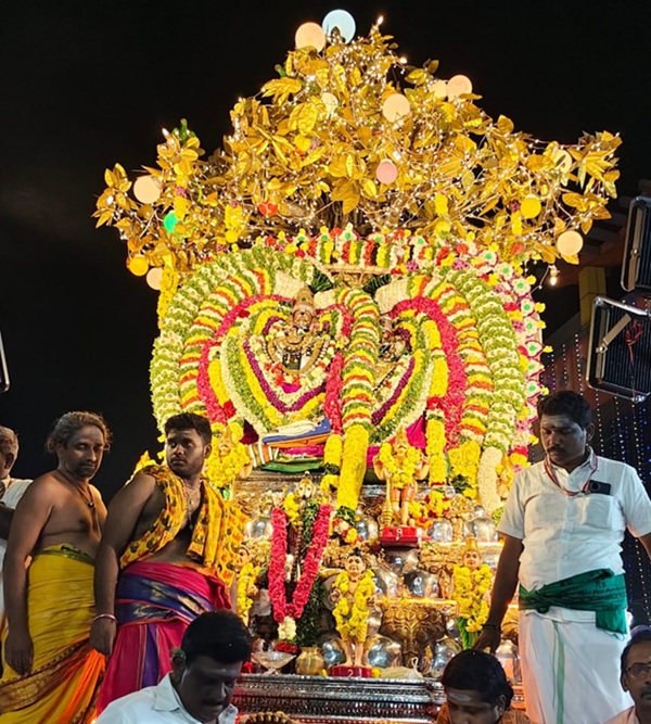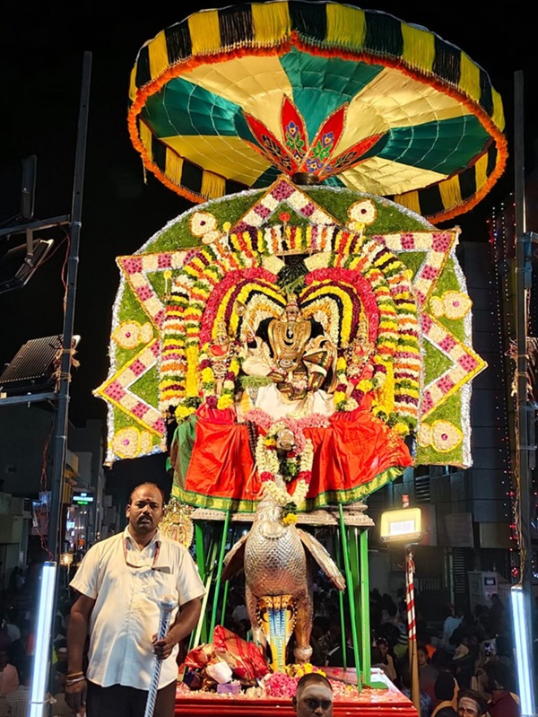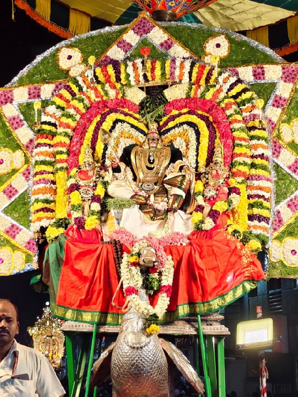 The 4th Night of the Tiruvannamalai Thiru Karthikai Deepam Brahmotsavam was celebrated with grand silver vahanam processions. Vinayagar graced the Silver Mooshika Vahanam, Murugar with Valli and Deivanai appeared on the Silver Peacock, Periyanayagar on the Karpavirutcham Vahanam, Parasakthi on the Silver Kamadhenu, and Sandikeswarar on the Silver Rishabam, blessing thousands of devotees.