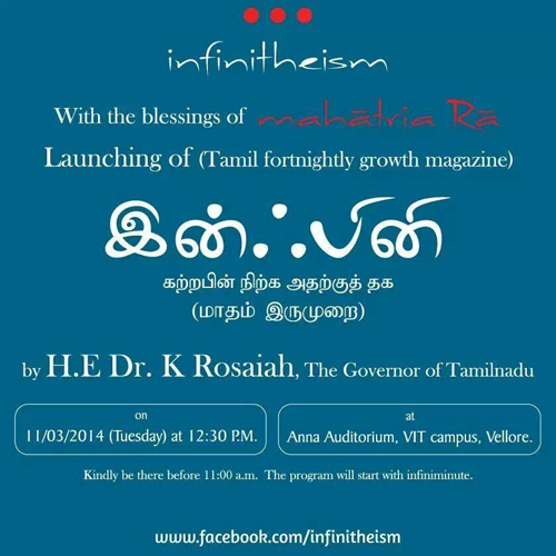 With the blessings of Mahatria Ra, the infini-Tamil (Tamil fortnightly growth magazine) launched by H.E Dr.K Rosaiah, The Governor of Tamil Nadu on today (Tuesday) at 12.30 PM at Anna Auditorium, VIT campus, Vellore.