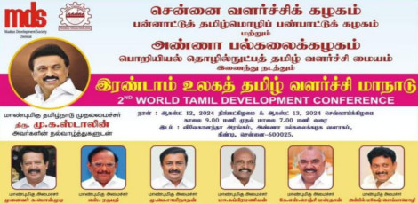 The 2nd World Tamil Language Development and Research Conference will be held on August 12-13 at Vivekananda Hall, Anna University, Chennai.