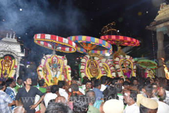 The deities of Panchamoorties (5 gods) seated on special carriages was taken on a proession around the streets adjacent to the temple corridors.