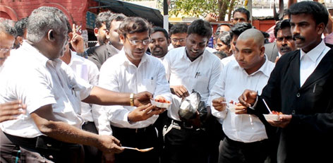 Chennai lawyers staged a beef eating protest in the Madras High Court campus yesterday for the ban on cow slaughter by Maharashtra Government.