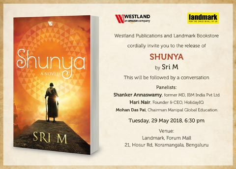 Well-known spiritual leader and founder of The Satsang Foundation, Sri M will launch his book Shunya: A Novel, published by Westland, on Tuesday, 29th May, 6.00 pm, at Landmark Book store in Bengaluru.