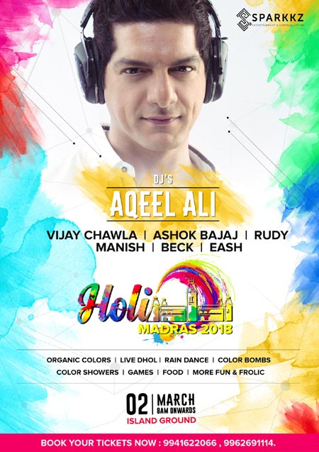 Gear up this Holi 02.03.2018, Chennai as Sparkkz Entertainment & Communication, is presenting - HOLI MADRAS 2018 with India�s best bollywood DJ, DJ AQEEL ALI along with other top DJ�s like Vijay Chawla,