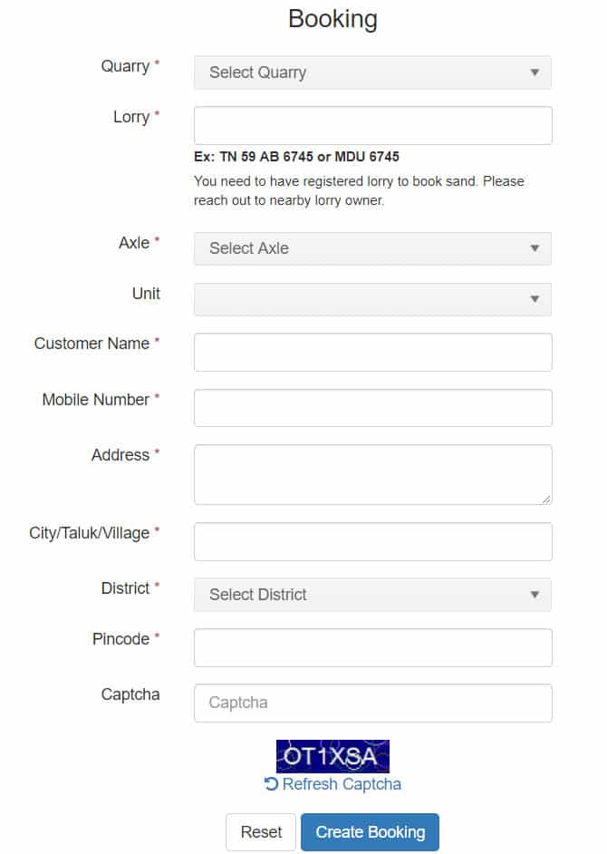 Tamil Nadu Online Sand Booking STEP 1: Visit the official website of Tamil Nadu Sand at www.tnsand.in. STEP 2: Click the General People button on the top right of the homepage. STEP 3: An application form similar to below would open on the next page, fill all the required information in the form and click "Create Booking" button at the bottom of the application form.