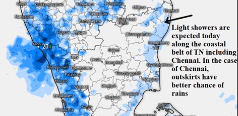 Light showers are expected today along the coastal belt of TN including Chennai. In the case of Chennai, outskirts have better chance of rains.