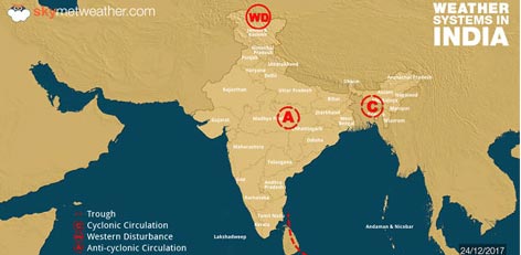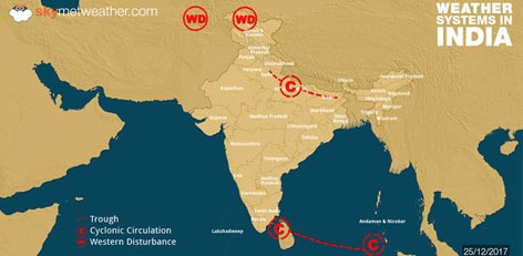 In south India, isolated light to moderate rain may occur over Tamil Nadu on December 26. Light to moderate rain is also expected over Andaman and Nicobar Islands on December 27.