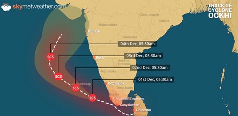 The very severe Cyclonic Storm Ockhi over Lakshadweep area and adjoining Southeast Arabian sea has moved west northwestwards with a speed of 12 kmph during the last 6 hours.